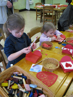 In the afternoon we went to the Winter Fair at a local Waldorf School. Jonathan and Charlotte made funny hats, Miriam a jump rope, Flora and Veronika made Valentines and all the children decorated candles. We ran into several familiar faces (Jonathan and Charlotte used to attend playgroup there and we go back frequently to participate in activities, plays, etc.). Then you notice how much your own children have grown!