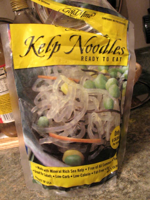 The other day I read about kelp noodles and thought that they might be an interesting product to try. When I saw them in one of the grocery stores yesterday, I had to buy them. So today I had kelp noodles with carrots, broccoli and sausage in a soy sauce. How did they taste? Not really like noodles, but more crunchy and salty. I liked the taste and what is really great about them is the fact that you don't have to cook them! Just rinse and eat them cold or reheat them.