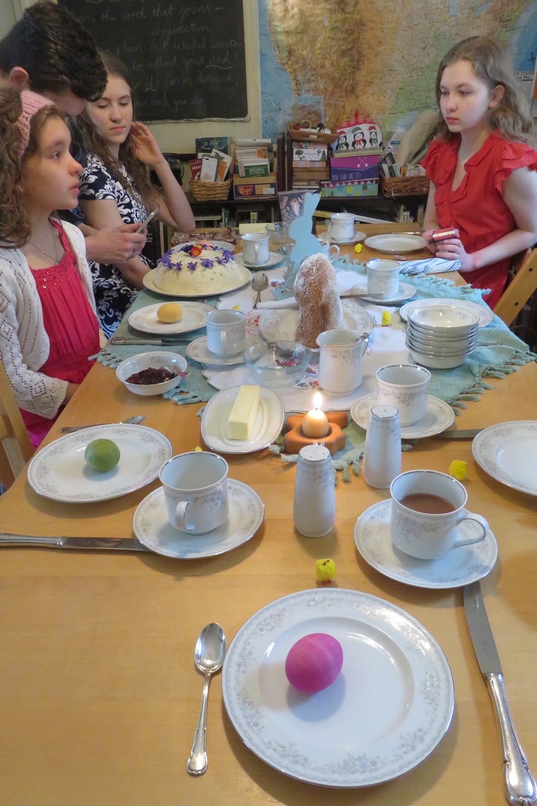 Happy Easter! What a joyful day for all of you. It's wonderful to see the children together, and to see your festive home and the delicious feast. I think you've really outdone yourself with the Pascha this year :) Thanks for including the Goethe poem. It's nice to read, and the Easter bunny was a nice surprise on your walk :0 xoxo (The snowman is turning into an interesting sculpture!)