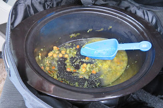 I bought an insulated carry bag for our slow cooker, which helps to carry it, but also to keep the food warm.
